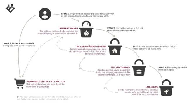 Därför är temat för dagens nyhetsbrev Fyra-hinkar-modellen. Det är kanske det enklaste sättet att försöka hitta rätt balans i hela sin ekonomi. Här får du en introduktion, du kan läsa vidare på hemsidan eller i våra fördjupningsavsnitt.